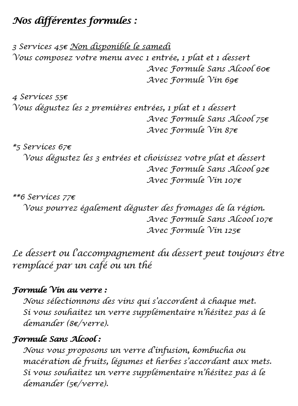 !! 2026 : La formule vin change : formule avec un verre de vin pour accompagner chaque met, y compris avec le dessert, il sera toujours possible d’avoir un ou plusieurs verre(s) additionnel moyennant un supplément.