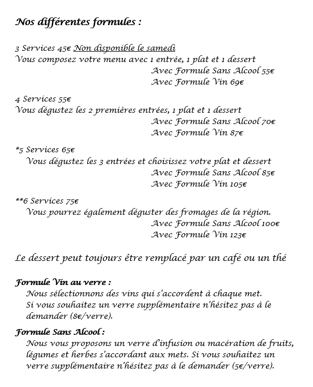 !! 2026 : La formule vin change : formule avec un verre de vin pour accompagner chaque met, y compris avec le dessert, il sera toujours possible d’avoir un ou plusieurs verre(s) additionnel moyennant un supplément.
